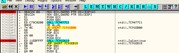 pirulo: log eip cmp eip, 7c91eaec je quitar cmp eip, 7c91eb03 je restaurar cmp eip,aux je restaurar2После расчёта исключений, смотрим вызывается ли по адресу возврату какое-нибудь из них, о котором мы знаем, что оно находится в точке возврата.