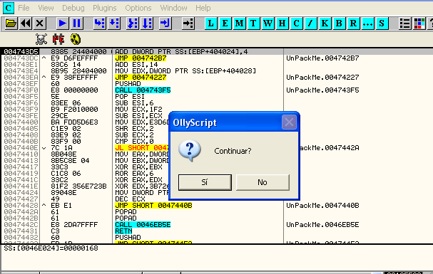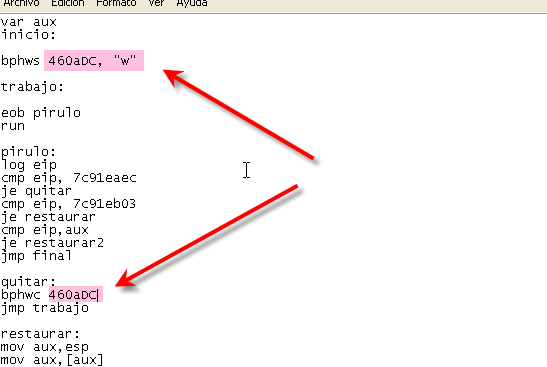 В части pirulo, где скрипт получает контроль по нахождению исключения, добавляем к ней сравнение EIP с 4743d5, чтобы узнать, действительно ли находимся в желаемом месте, и оттуда прыгаем к reparar, где и творится магия.