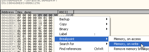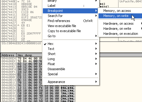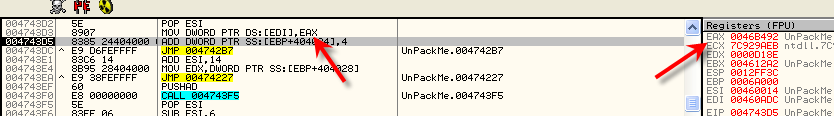 Проверим, происходит ли запись в переадресовочную зону, для чего нам не нужно идти до OEP, смотрим 46b492: