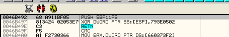 Видим, что переадресация довольно дурацкая – здесь помещается в стек 5bf11a9, а затем это значение XOR'ится с 793e0502. Результат этой операции становится первым значением стека, и когда доходит до выполнения RET'а, возврат произойдёт по этому адресу.
