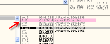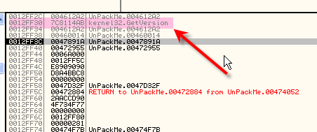 Если поднимемся чуть выше по стеку, то увидим там правильный адрес API-функции. Теперь нам нужно узнать, работает ли это для все переадресовочных элементов, так что останавливаем скрипт.