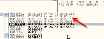 И видим, что это API-функция MulDiv. Если нас не затруднит пойти в переадресовочную область и сделать XOR, что ведёт сюда, так что мы видим возможность починки. Хорошая API-функция расположена в стеке, а точнее в [ebp-0c].