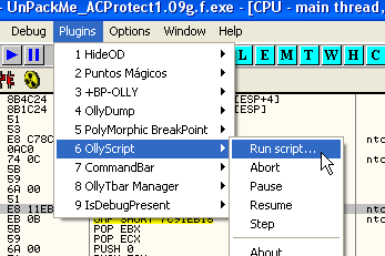 И сейчас находимся на OEP. Ниже рассмотрим, как улучшить скрипт, чтобы автоматически устанавливать две точки останова, и чтобы запрашивался адрес HBP. Пока редактировать не будем, послужит нам как есть.