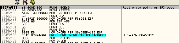 Вот эта секция. Если спустимся ниже и посмотрим образ точки входа, где запускается упаковщик, то вспомним, что это был адрес 46b000, поэтому упаковщик не заморачивался сильно с созданием новой секции, чтобы скрыть в ней API-функции.