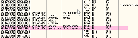 Видим ворох элементов, которые в данном случае являются переадресовочными не в секцию, созданную упаковщиком. Может в ту же секцию, где исполняется сам упаковщик? Смотрим карту памяти.