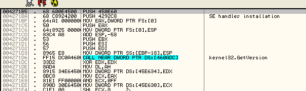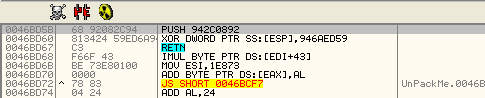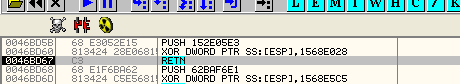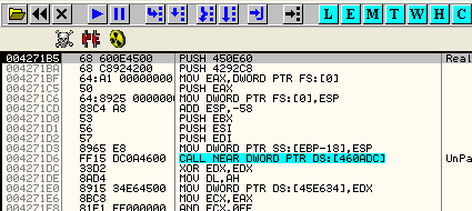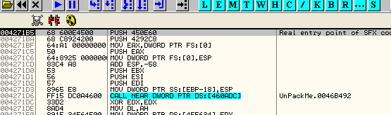 Видим, что результатом XOR является 46E5CB – это значение, которое скрипт поместит в элемент, поэтому скрипт не ошибается. Дело в том, что этот элемент особенный, так что рестартуем и прибываем в OEP, что посмотреть, найдём ли то, к чему динамически относится API-функция, то есть, откуда она запускается.