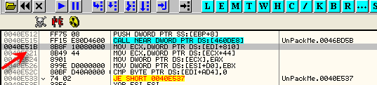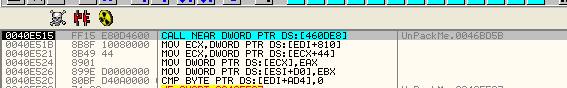 Видим, что скрипт изменил его на значение, которое в данном случае равно 46E5CB, так что видим значение, которое сохраняется в IAT без использования скрипта. Нажимаем F7.