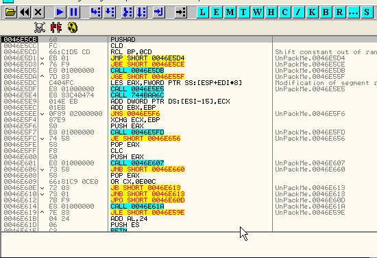 Посмотрим, ведёт ли это к какой-нибудь API-функции. Начинаем трассировать с помощью F7 и видим, что это ведёт в большой кусок кода, так что применяем метод pushad. Вот эта инструкция в начале, и останавливаемся на POPAD, до куда нужно оттрасировать некоторое количество строк.