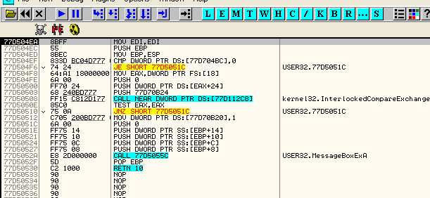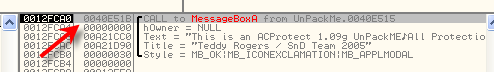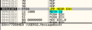 И видим, что API-функция, с которой у нас проблемы – это MessageBoxA.