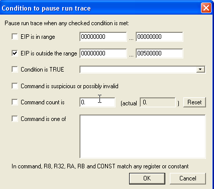 Другой, более быстрый метод – это сделать RUN TRACE с условием, что необходимо остановиться, когда EIP станет, например, больше 500000, то есть когда произойдёт выход из секции в API-функцию. Смотрим: