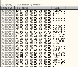 И сохраняем его как dumped_.exe. Нам осталось исправить OEP на предмет украденных байтов, так что открываем файл в OllyDbg.