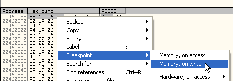 Можем посмотреть, что случится, если бы эта ошибка не была показана. Рестартуем OllyDbg и устанавливаем на этот элемент MEMORY BREAKPOINT ON WRITE.
