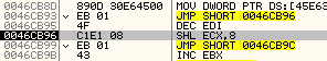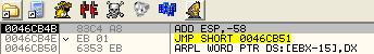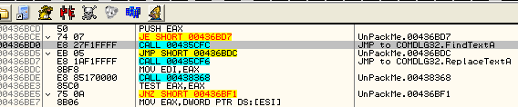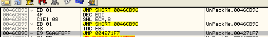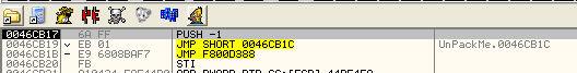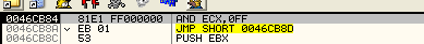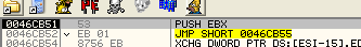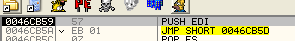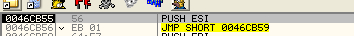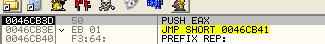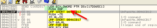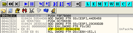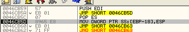 Теперь остановились на PUSH EBP, что весьма похоже на команду из OEP. Чтобы проверить это предположение, воспользуемся, хе-хе, трассировкой. Конечно же, JMP’ы нас не интересуют, так как они не влияют на состояние регистров или стека.