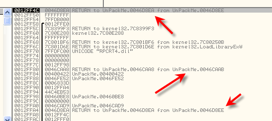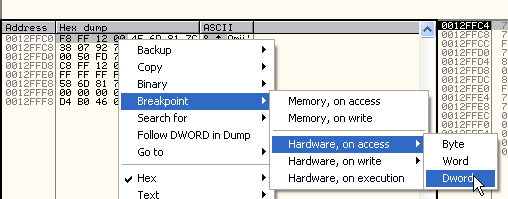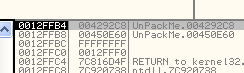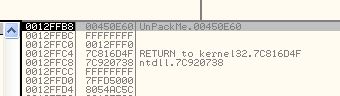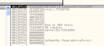 Здесь видно, что перед запуском анпэкми адрес вершины стека равен 12FFC4 (так на моем компьютере). Это означает, что при прибытии к истинной OEP вершина стека должна находиться по тому же адресу, то есть в 12FFC4. Обычно первой командой программы является PUSH EBP, которая записывает значение в следующую ячейку стека (12FFC0), поэтому найдем ее в дампе и установим на ней HARDWARE BPX ON WRITE. Такое рассуждение логично, но оно может и не дать результатов, если упаковщик обнаруживает аппаратные брейкпоинты или, для осложнения поиска OEP, меняет адреса стека.