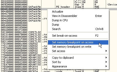 Открыв карту памяти, установим MEMORY BREAKPOINT ON ACCESS в первой секции после заголовка. Этот брейк равнозначен ON EXECUTION, поскольку, как помните, пропатченная для поиска OEP’ов версия отладчика в данном случае останавливается только при выполнении, а не при чтении или записи.