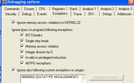 Следует убедиться, что все галки во вкладке Exceptions окна Debugging options установлены: