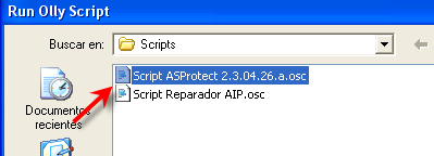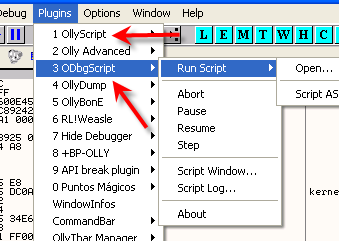 Хотя это всего лишь новая версия OllyScript’а, в меню отображаются оба плагина, поэтому следует выбрать новый и в нем открыть скрипт Hiei: