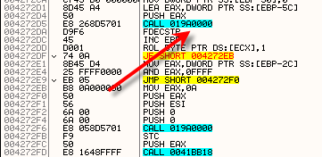 mov base_aspr,[46C048] // В 46C048 сохранено основание секции, где определяется, к каким API-функциям должны направлять CALL’ы. add base_aspr,3B02E // К этому основанию добавляется константа для получения адреса, по которому видна API-функция. bphws base_aspr,"x" // Установка HBP на адрес, где видна API-функция. jmp buscarПо адресу программы 46C048 сохранена база той секции, где определяется API-функция. После извлечения база суммируется с константой, и так находится ключевое место на любом компьютере, потому что секции равны, а варьируется лишь начальный адрес. В данном случае ключевое место — 3B02E от начала, и после его вычисления на нем устанавливается HBP для остановок при выполнении.