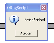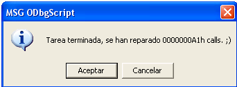 ejecutar: // CALL ведет к Аспру. mov eip,dir // В eip копируется адрес найденного CALL’а, ведущего в Аспр, run // и программа запускается. eob comprobar // Если срабатывает BP, управление передается на метку 'comprobar'.Здесь предусмотрена проверка BP на случай, если кто-нибудь забыл удалить отработанный BP или Break-on-execute, что могло привести к исключениям и нарушению в работе скрипта: