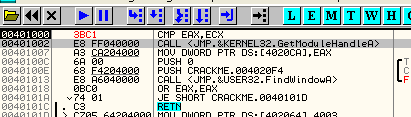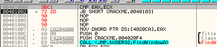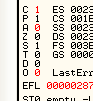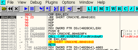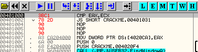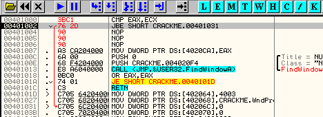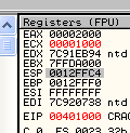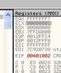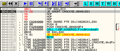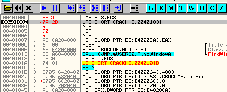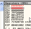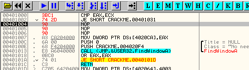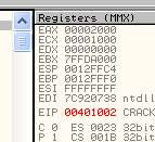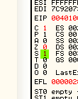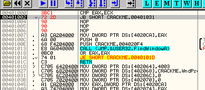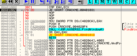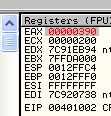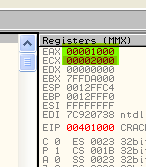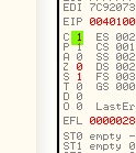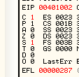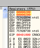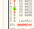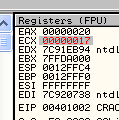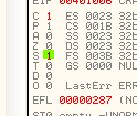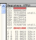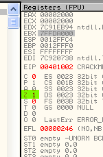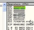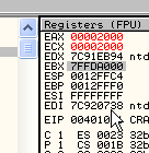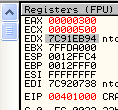 CMP EAX, ECXПусть EAX и ECX равны, они будут вычтены друг из друга, значение их не изменится, но результатом операции станет то, что активируется флаг Z. Рассмотрим пример в OllyDbg.