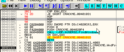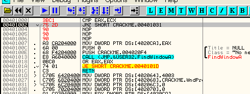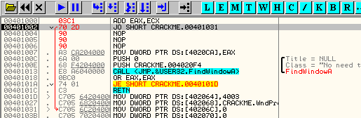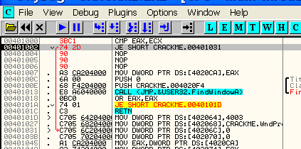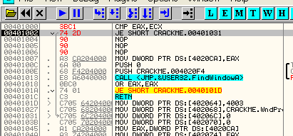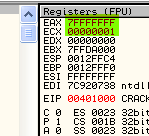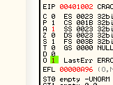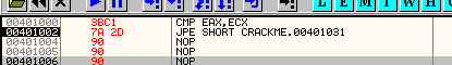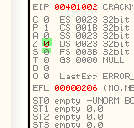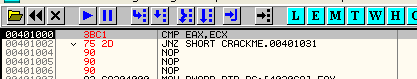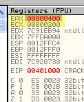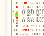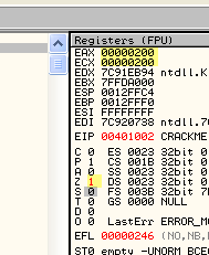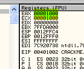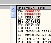Таким же образом программа может вынести решение относительно двух серийных номеров, один из которых интересует вас на предмет регистрации программы и содержится, скажем, в EAX, а второй находится в EAX и является правильным серийным номером. Программа может определить с помощью CMP, являются ли они равными, и если да (флаг Z будет активным), совершить переход с помощью JZ в ту область, где происходит регистрация. А если введённый вами серийный номер, находящийся в EAX, и правильный в ECX окажутся не равны, то флаг Z будет содержать НОЛЬ, и, соответственно, никакого перехода не произойдёт.