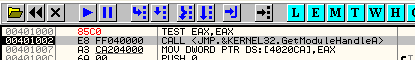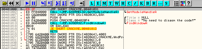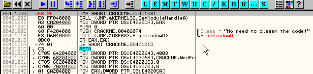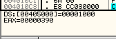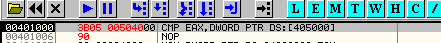 Здесь сравниваем EAX с содержимым 405000, и, как обычно, окошко с пояснениями нам даёт значение каждого из операндов. В моём случае они следующие: