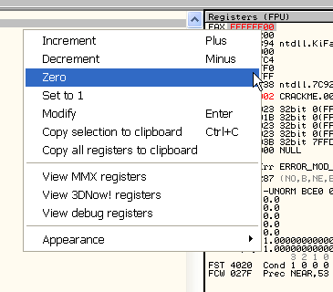 В OllyDbg это делается очень легко правым кликом мыши на нужном регистре и вводом НУЛЯ.