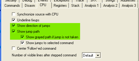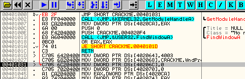 Видим, что теперь OllyDbg показывает нам красной линией откуда и куда совершается переход, в данном случае в 401031.