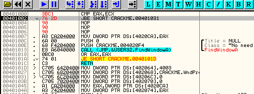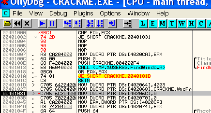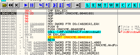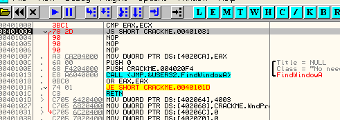 Напишем в OllyDbg две инструкции, которые делают сравнение и совершают переход, если сравнение оказалось удачным.