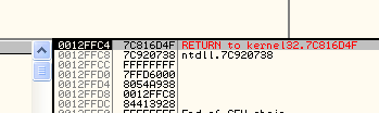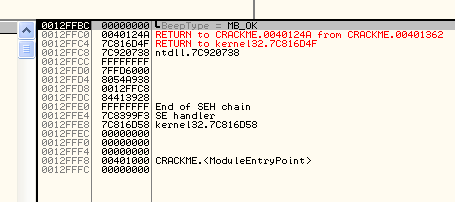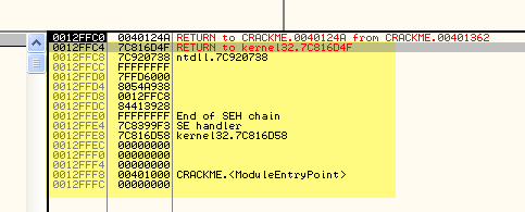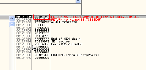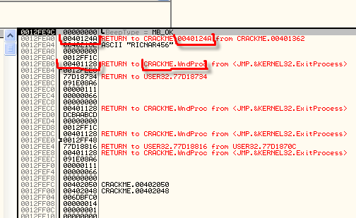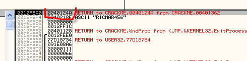 Видим сразу несколько RETURN TO... Видимо, мы находимся внутри процедуры и самый верхний RETURN TO содержит адрес возврата, на который передаст управление ближайший RET. Этот адрес, вероятно, окажется на верхушке стека, перед выполнением RET и управление будет передано на адрес 40124A.
