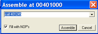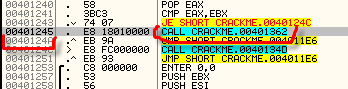 Рассмотрим ещё один закрепляющий пример. Для этого нужно перезагрузить крэкми в отладчике, сразу нажать на клавишу пробела и ввести следующую инструкцию: CALL 401245.