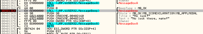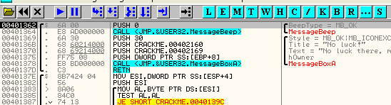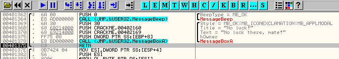 Выскакивает сообщение о том, что нам не повезло, т.е. крэкми не понравились наши имя и серийник (было бы просто удивительно, если бы мы сразу угадали правильные регистрационные данные :smile3: Если закрыть это сообщение, активизируется наконец наша точка останова.