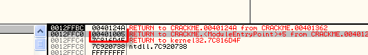 Сверху вниз первый RETURN TO указывает на возможный адрес возврата из текущей процедуры. В данном конкретном случае - это адрес 40124A.