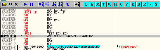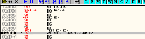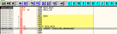 XOR ECX,ECX ADD ECX,15h метка_начала_цикла: DEC ECX ; тело цикла TEST ECX,ECX JNE метка_начала_циклаМожно придумать ещё более компактные версии циклов, но пока ограничимся последней. Давайте впишем этот код в OllyDbg: