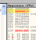 Также как и раньше, осуществляется переход на адрес 401007, т.к. счётчик ещё не равен нулю. Замечаем, что счётчик уменьшился на 1 - теперь в ECX хранится значение 14h.