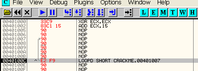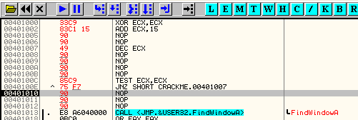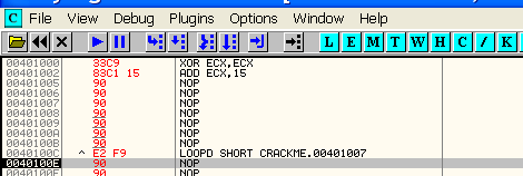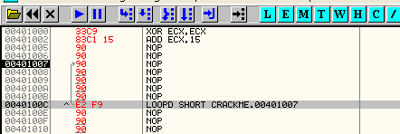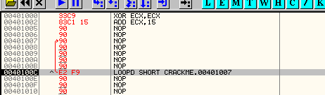 Жёлтым выделен код цикла, который будет повторяться пока значение ECX не достигнет нуля. Тело цикла содержит несколько инструкций NOP.