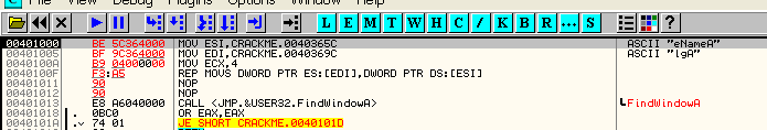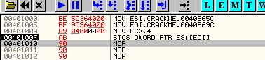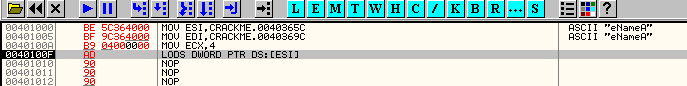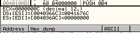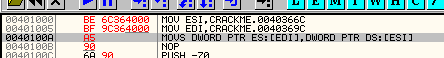 Данная инструкция копирует данные из одного адреса в другой. Адрес источника хранится в регистре ESI, адрес приёмника - в EDI. Инструкция не нуждается в явном указании параметров, но OllyDbg дизассемблирует её как MOVS DWORD PTR ES:[EDI],DWORD PTR DS:[ESI] для наглядности. Вот как это выглядит: