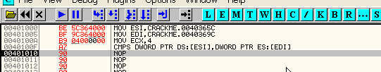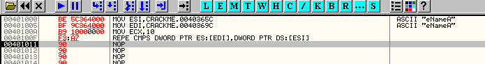 Продолжаем нажимать F7 до тех пор, пока операнды не окажутся разными. В данном случае это должно произойти до того как истощится счётчик ECX. Ага, вот: