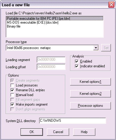 А вот интерактивные позволяют "вручную" управлять процессом "препарирования" программы. В любой момент мы можем сказать дизассемблеру "парень, ты гонишь" и помочь этому парню, например, отличить адреса от констант либо определить границы инструкций и т. д. Соответственно, интерактивные дизассемблеры имеют хорошо развитый пользовательский интерфейс, а некоторые (не буду показывать пальцем, все наверняка уже догадались, какой дизассемблер я имею в виду) имеют даже собственный си-подобный язык скриптов! И более даже более того - являются виртуальной программируемой машиной!#4. Итак, давайте проведем первое знакомство с этим плодом человеческого гения... Запускаем ИДУ и озадачиваем ее нашим исполнимым файлом (File > Open).