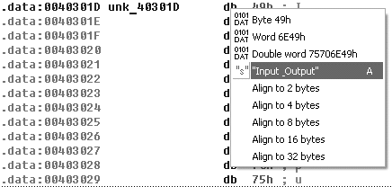 Перемещаем указатель наunk_403000, жмем на Enter и перепрыгиваем назад в секцию данных.#6. Честно говоря, мне не нравится то, какой простыней Ида дизассемблировала блок данных. Хотелось бы лицезреть его в таком виде, каков он был в исходном тексте ;). Для этого ставим указатель на последний db в секции данных и жмем на правую кнопку мыши, а вывалившейся контекстной менюшке
