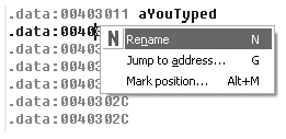 .data:00403000 _data segment para public 'DATA' use32 .data:00403000 assume cs:_data .data:00403000 ;org 403000h .data:00403000 aTypeSomething db 'Type something > ' ; DATA XREF: start+2B_o .data:00403011 aYouTyped db 'You typed > ' ; DATA XREF: start+6D_o .data:0040301D aInputOutput db 'Input & Output',0 ; DATA XREF: start+9_o .data:0040302C align 200h .data:0040302C _data endsЖелающие могут обозвать метки по-своему. Для этого кликните правой кнопокой по адресу и выберите пункт Rename.