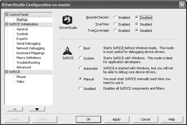 Итак, после установки (и появления на панеле задач соответствующей ветки меню), первое, что мы должны сделать, это выбрать тип его загрузки. Для этого запускаем программу конфигурирования (Start > NuMega DriverStudio > SoftIce > Settings) и видим следующее окошко:
