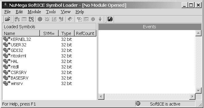 В левом окне мы видим, из каких файлов подгружена символическая информация. Зеленая лампочка в строке статуса свидетельствует о том, что отладчик подгружен (конечно, если вы это сделали после перезагрузки). Правое окно - это окно отчета, там появляется информация о выполненных действиях, ошибках и т.д. Ах да…, еще есть заголовок окна, там помимо названия программы есть еще и надпись в скобках [No Module Opened], то есть "не открыт модуль". Не правда ли, не очень тонкий намек?