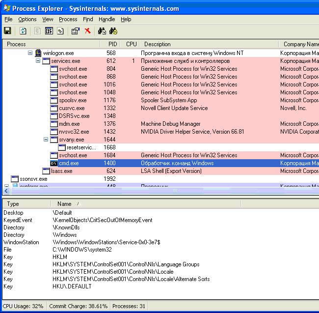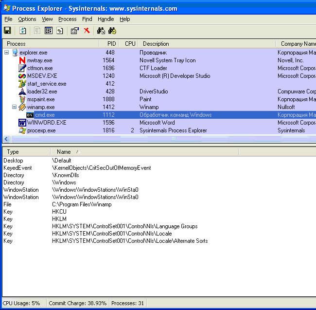 К примеру, Вы видите процесс CMD.EXE, “порожденный” в недрах WinAmp, который по всем правилам получил Desktop и виден “на поверхности”.
