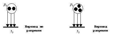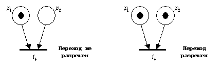 Переход называется разрешенным, если каждая из его входных позиций имеет число фишек по крайней мере равное числу дуг из позиции в переход. Прочитайте предыдущее предложение еще пару раз. Например, если позиции