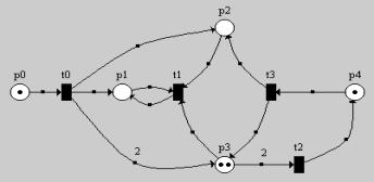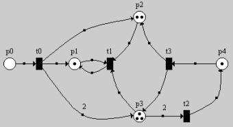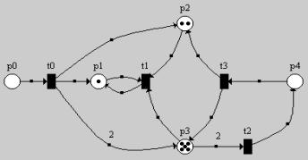 (обратите внимание - из t0 в p3 идет ДВЕ дуги!!! Поэтому в p3 добавилось ДВЕ фишки).