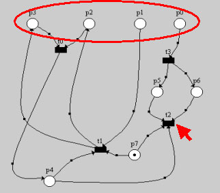 Допустим, что при начальной маркировке можно задавать кол-во фишек только в позициях p0…p3. (обратите внимание, что позиция p7 изначально содержит одну фишку). Остальные позиции недоступны для маркирования. Зададим ключевому переходу t2 наименьший приоритет (это означает, что если одновременно разрешены переходы t2 и t1, то сработает переход t1), после чего он (переход t2) выполниться тогда и только тогда, когда начальная маркировка помечает позиции p0…p3 следующим образом: p0=1, p1=0, p2=1, p3=1. При всех остальных допустимых начальных маркировках переход t2 не сработает. Если не верите то попытайтесь на практике опровергнуть это утверждение, но уверяю вас – ничего не выйдет.