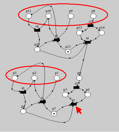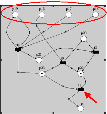 При этом переход t2 остается ключевым и появляются новые позиции (p8…p11), которые можно пометить при начальной маркировке (фактически позиции p8…p11 дублируют смысловое значение позиций p0…p3 в нижней сети).