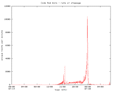 В этом свете весьма показателен процесс распространения вируса Code Red, в пике своей эпидемии заразившего свыше 359.000 узлов в течении 24 часов. Как были получены эти цифры? Программа-монитор, установленная в локальной сети Лаборатории Беркли, перехватывала все проходящие через нее IP-пакеты и анализировала их заголовки. Пакеты, адресованные несуществующим узлам и направляющиеся на 80-й порт, были очевидно отправлены зараженным узлом (Code Red распространялся через уязвимость в MS IIS-сервере). Подсчет уникальных IP-адресов узлов-отправителей позволил надежно установить нижнюю границу численности популяции вируса. При желании процесс расползания вируса по всемирной сети можно увидеть и в динамике – www.caida.org/analysis/security/code-red/newframes-small-log.mov. Там же, на странице http://www.caida.org/analysis/security/code-red/coderedv2_analysis.xml, содержится текст, комментирующий происходящее зрелище. А зрелище и впрямь получилось впечатляющим и… поучительным. Всем, особенно разработчикам вирусов, настоятельно рекомендую посмотреть. Быть может это научит кое-кого не ронять сеть своим очередным… ммм… творением.