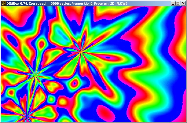 Графика DOS. Цветок В общем, палитру выставляйте как хотите, главное, чтобы переходы между цветами были плавными. Для хранения изображения "цветка", заведем массив flower, размером 640x400. Нарисуем в нем наш "цветок". Формулу для рисования "цветка" можно найти в любом нормальном учебнике по "вышке". Для всех тех кто уже успел забыть этот кошмар или у кого он еще не начался, так уж быть, вот процедура инициализации массива: Код (C): for(long y=-200;y<200;y++) for(long x=-320;x<320;x++) flower[(x+320)+(y+200)*640]=0.75*cos(16*atan2(y,x))*256/TWO_PI+ 1.5*sin(8*atan2(y,x))*256/TWO_PI+ sqrt(x*x+y*y); Меняя коэффициенты в формуле можно получить довольно забавные версии этого эффекта. В результате мы получим в массиве flower красивый такой цветок или не совсем красивый или совсем не красивый... Психоделическая составляющая эффектаТеперь определимся сколько нам потребуется "цветков" на экране, мне хватило трех, при большем количестве "цветков" на экране довольно трудно становиться понять, что твориться на экране. Правда если хочешь "словить глюков" - поставь цветков так 5 - 7 и смотри на экран минут этак пять, глюков может и не словишь, но глаза заболят обязательно. Но перед тем, как мы начнем наслаждаться резью в глазах надо еще сделать кое-что. Возьмем какую-нибудь точку в массиве flower, причем не любую, а такую, чтобы X координата лежала в промежутке от 0 до 320, а Y координата в промежутке от 0 до 200. Начиная с этой точки скопируем кусок массива, размером 320x200, на экран. Получим изображение куска "цветка". Если теперь сдвигать начальную точку, в каждом новом кадре, на новое место, то получим изображение перемещающегося цветка. Теперь допустим, что начальных точек две, и на экран копируется не один кусок "цветка", а два. Причем накладывается они друг на друга обычным сложением цветов. В результате получим требуемый эффект. Вот. Реализуется это примерно так: Код (C): x=160+120*sin(time*0.5+1.0); y=100+90*cos(time*1.5+2.0); offset1=x+(y<<7)+(y<<9); x=160+120*sin(time*1.0+1.5); y=100+90*cos(time*2.0+0.5); offset2=x+(y<<7)+(y<<9); for(y=0;y<200;y++) for(x=0;x<320;x++) { screen[x+(y<<6)+(y<<8)]=flowers[x+(y<<7)+(y<<9)+offset1]+ flowers[x+(y<<7)+(y<<9)+offset2]; } Добавить еще "цветков" думаю вам не составит труда. Взято здесь, текст программы немного переделан, в результате СОМ-файл уменьшился с 1106 байт до 885 байт Код (ASM): ; masm dos com # .model tiny .code .686p .mmx org 100h VGA_SEGMENT equ 0A000h IMPUT_STATUS_0 equ 3DAh ;регистр статуса ввода 0 WIDTH_SCREEN equ 320 HEIGHT_SCREEN equ 200 SCREENSIZE equ WIDTH_SCREEN*HEIGHT_SCREEN MEMBLOCKSIZE equ SCREENSIZE/16 start: flowers equ word ptr [bp-40] screen equ word ptr [bp-38] i equ word ptr [bp-36] c0 equ word ptr [bp-34] v equ dword ptr [bp-32] u equ dword ptr [bp-28] offset1 equ dword ptr [bp-24] offset2 equ dword ptr [bp-20] offset3 equ dword ptr [bp-16] x equ dword ptr [bp-12] y equ dword ptr [bp-8] time equ dword ptr [bp-4] mov sp, 0D60h mov ah, 4Ah; ADJUST MEMORY BLOCK SIZE (SETBLOCK) mov bx, 0D6h; ES = segment address of block to change int 21h ; BX = new size in paragraphs enter 40, 0 mov time, 0 mov bx, MEMBLOCKSIZE mov ah, 48h; DOS - 2+ - ALLOCATE MEMORY int 21h ; BX = number of 16-byte paragraphs desired mov screen, ax mov bx, MEMBLOCKSIZE*4 mov ah, 48h; DOS - 2+ - ALLOCATE MEMORY int 21h ; BX = number of 16-byte paragraphs desired mov flowers, ax ;initflower------------------------------------------ mov y, -HEIGHT_SCREEN a0: mov x, -WIDTH_SCREEN @@: mov eax, x imul eax mov v, eax; v = x^2 mov eax, y imul eax add eax, v mov u, eax fild u ;u = x^2 + y^2 fsqrt fild x fild y fpatan fld st fmul const16 fcos fmul const96 fxch st(1) fmul const8 fsin fmul const192 faddp st(1), st fldpi fdivp st(1), st faddp st(1), st fistp v mov edi, y add edi, HEIGHT_SCREEN imul edi, WIDTH_SCREEN*2 add edi, x add edi, WIDTH_SCREEN;esi=(y+200)*640 + x + 320 mov eax, edi shr eax, 16 shl ax, 12 add ax,flowers mov es, ax mov al, byte ptr v stosb;flowers[(x+320)+(y+200)*640]= ;= 0.75*cos(16*atan2(y,x))*256/TWO_PI+ ;+ 1.5*sin(8*atan2(y,x))*256/TWO_PI+ ;+ sqrt(x*x+y*y); inc x cmp x,WIDTH_SCREEN jl @b inc y cmp y,HEIGHT_SCREEN jl a0 mov ax, 13h int 10h ; - VIDEO - SET VIDEO MODE ;setcolortable------------------------------------------- mov i,255 mov cx,43;256-213 @@: mov ax, i sub ax, 213 imul ax,3 shr ax,1 mov c0,ax neg ax add ax,63 push i push 63 push 0 push ax ;63-(i-213)*3/2 call setrgbpalette dec i loop @b mov cx,42;213-171 @@: push i push c0 push 0 push 63 call setrgbpalette dec i loop @b mov c
